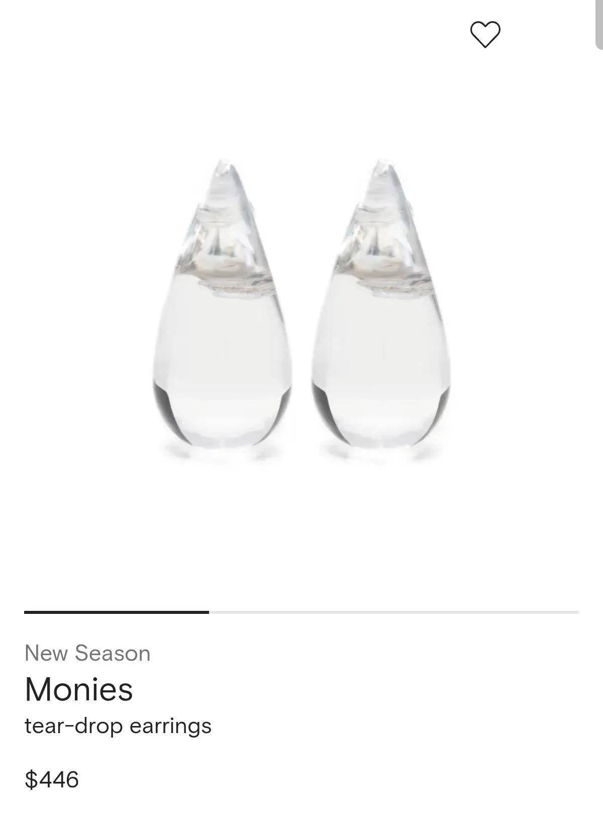 王菲戴的这副耳饰是MONIES tear-drop earrings,价值三千块。这个品牌是1973年在哥本哈根创立的,王菲让这个小众品牌一夜之间火了。看春晚的时候还在想她是怎么戴的耳饰,其实王菲戴的这副耳饰是耳夹款。