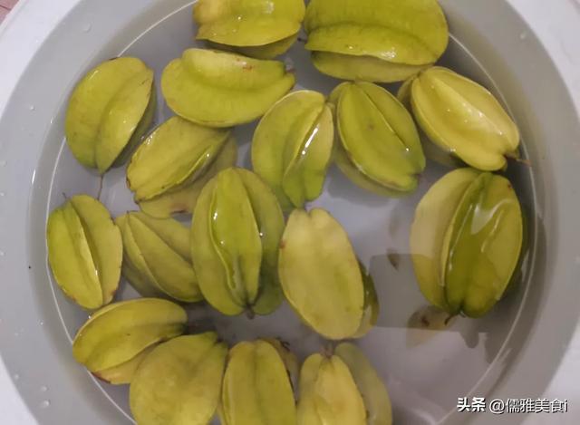 1. 杨桃用盐搓洗表皮,冲洗干净后去掉果棱,切成薄片。